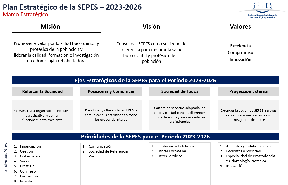 Tras un exhaustivo proceso de reflexión interno y externo se ha redefinido su Misión, concretándola en “Promover y velar por la salud buco-dental y protésica de la población y liderar la calidad, formación e investigación en odontología rehabilitadora”, su Visión, “Consolidar SEPES como sociedad de referencia para mejorar la salud buco-dental y protésica de la población”, y sus Valores, “la excelencia, el compromiso y la innovación”, con el objetivo de marcar la nueva hoja de ruta de SEPES.